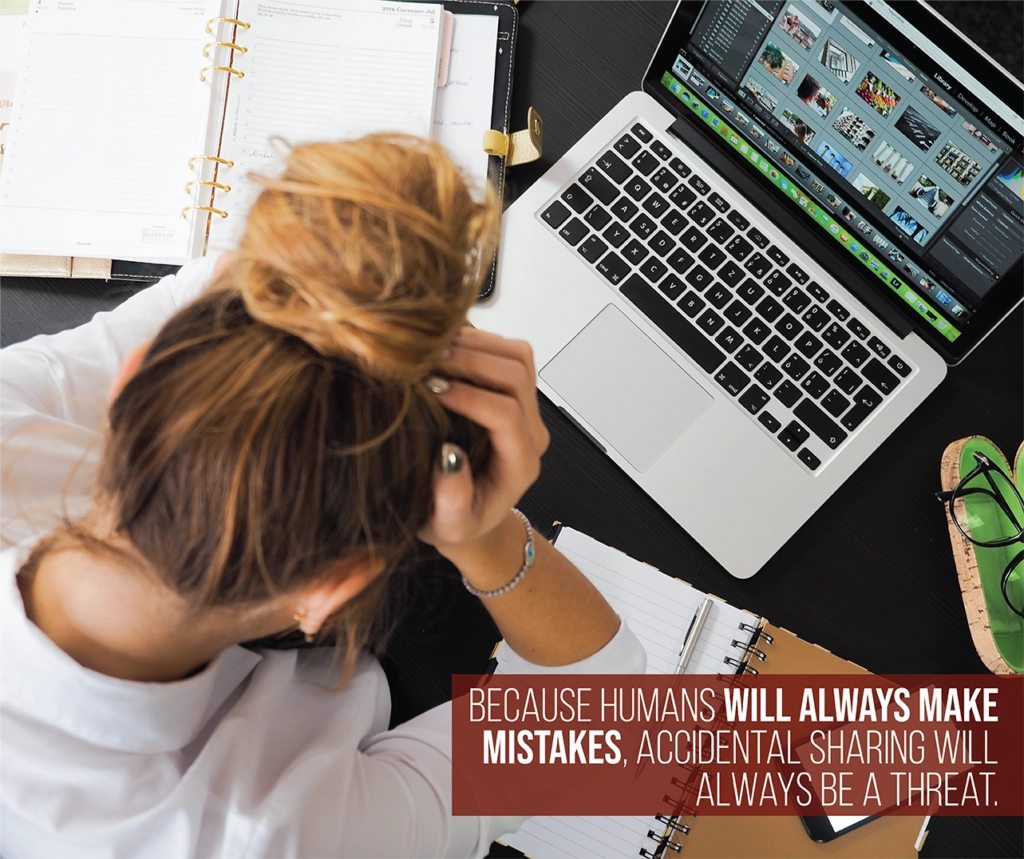 Accidental sharing includes personal or business data, and it is shared through emails, unsecured forms, messaging or social media platforms, and a host of other ways.