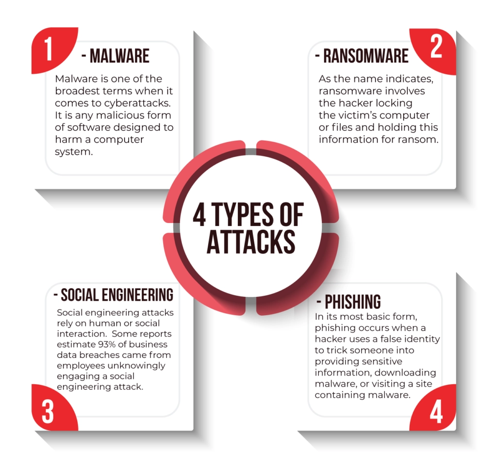 So, what are some of the most common cyberattacks? While many exist, let’s look at four of the most common attacks.