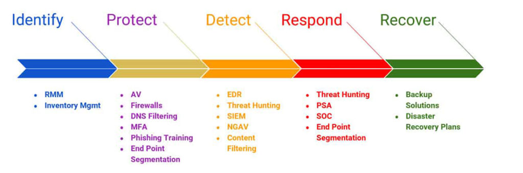 Our framework core is to Identify, Protect, Detect, Respond, and Recover to achieve desired outcomes.